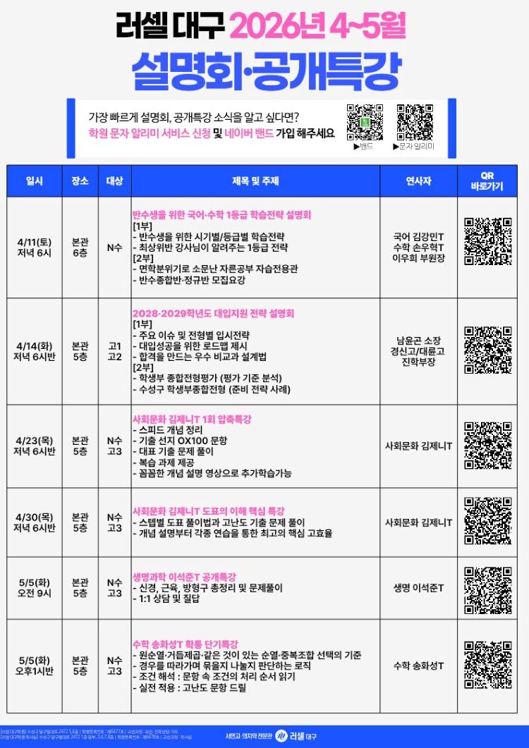| ¡á ·¯¼¿ ´ë±¸ 4~5¿ù ¼³¸íȸ¡¤°ø°³Æ¯° ÀÏÁ¤ ¾È³» ¡á (3/27 ±âÁØ) | |||