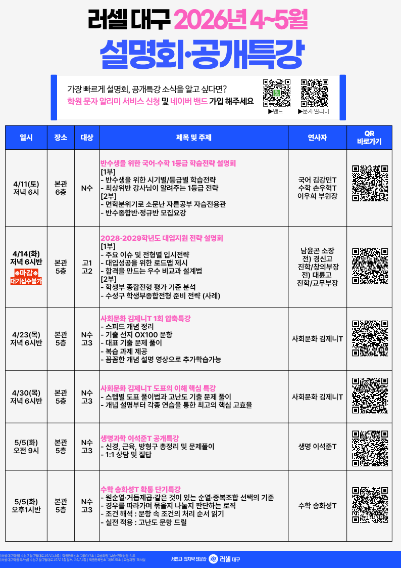 | ¡á ·¯¼¿ ´ë±¸ 4~5¿ù ¼³¸íȸ¡¤°ø°³Æ¯° ÀÏÁ¤ ¾È³» ¡á (4/1 ±âÁØ) | |||