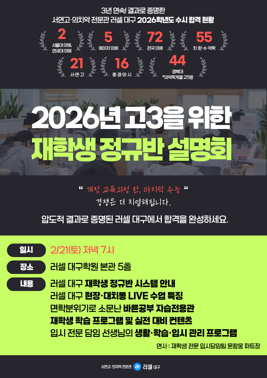 | ¡¼°í3¡½ 2026³â °í3À» À§ÇÑ ÀçÇлý Á¤±Ô¹Ý ¼³¸íȸ (2/21) | |||